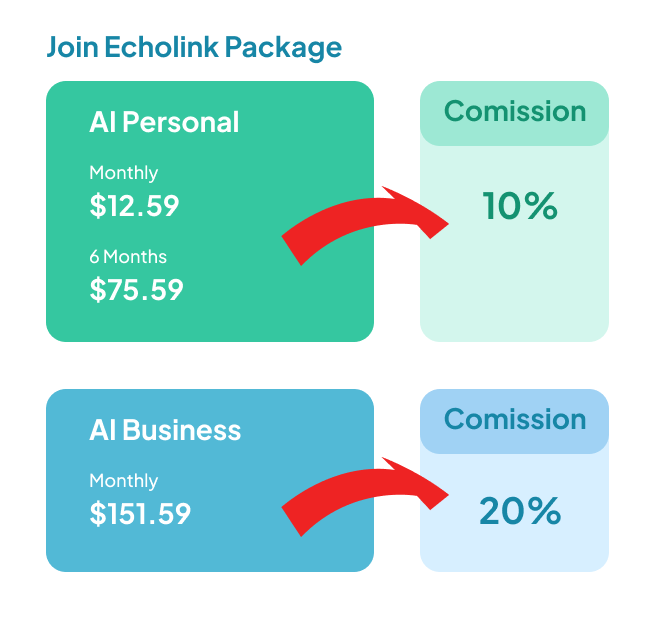Join by selecting the available Echolink package. Echolink has 2 packages, AI Business and AI Personal, you can choose a monthly or 6 monthly subscription.